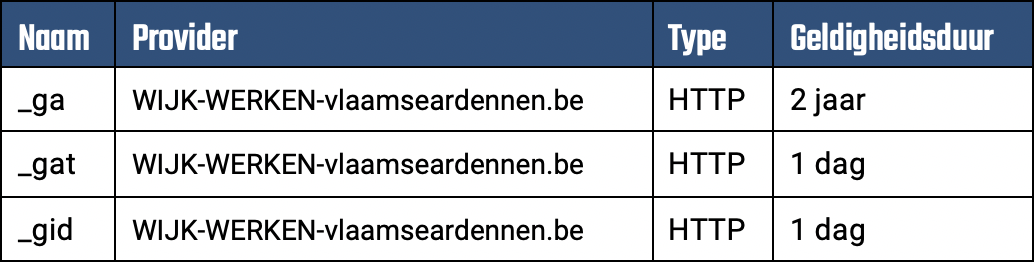Artikel 4. Welke cookies gebruikt WIJK-WERKEN VLAAMSE ARDENNEN VZW, voor welk doel en wat is de geldigheidsduur?